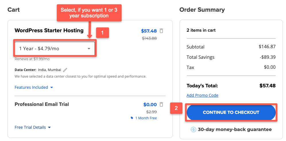 Now you have to choose a year, such as one or three years. Once you select the year, click on the Continue To Checkout button.