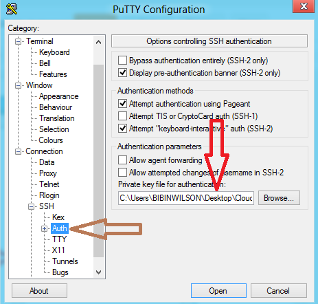 Now go to SSH-->Auth click on Auth and load the .ppk file you generated using Puttygen.