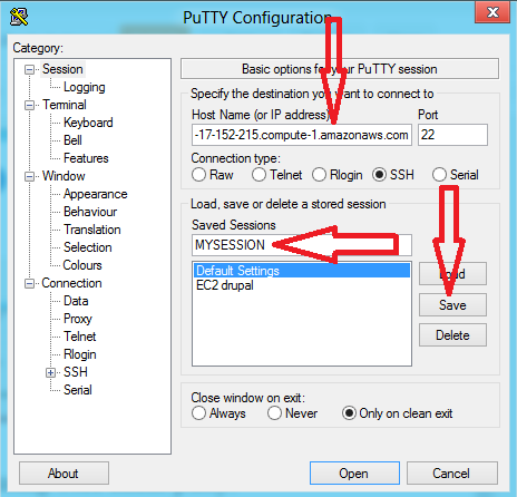 and enter the hostname or IP (public or elastic IP) as shown in the image below.