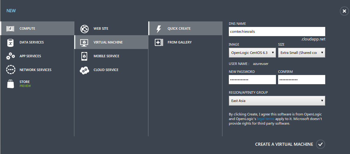 3.For quick create, give a DNS name which will be unique and using which you can access your deployed web application. Select the Openlogic Centos 6.3 from the images and select the extra small instance. Also provide a password, the username by default will be azureuser. Once you filled up all the details, click create virtual machine option.