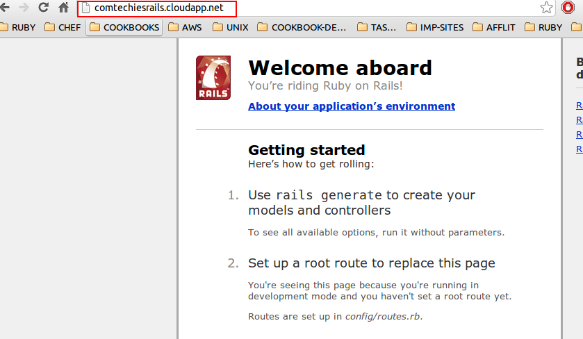 10. Once the server has started you can access your created application using the DNS provided by Azure. Eg: demoapp.cloudapp.net. The default rails application page will show up when you access the Public DNS.