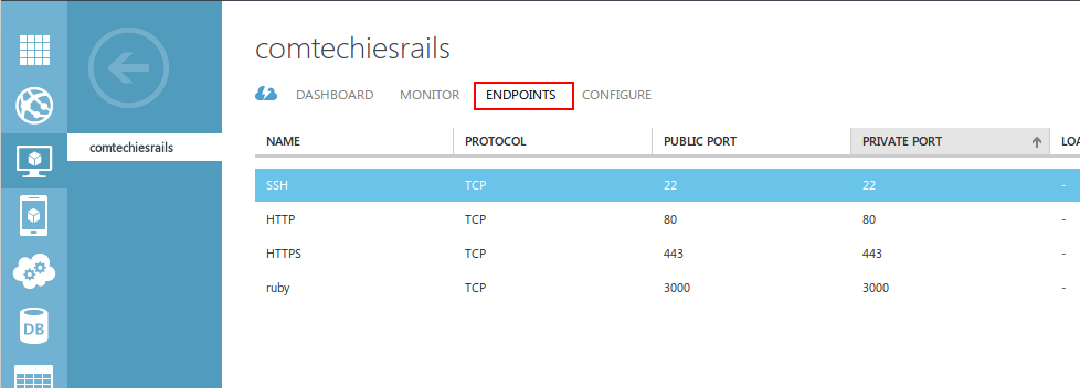 8. Now we have an application and in order to access it through the DNS provided by azure you have to specify the inbound firewall rules called endpoints in the azure portal. Click on the virtual machine and select the endpoints option. Click add and add http enpoint, so that you can publicly access the rails application using the DNS provided by Azure.