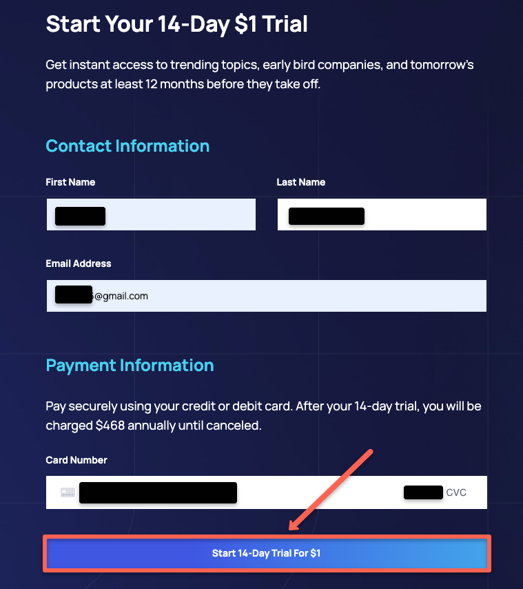 Step 5: Fill out the details, such as name, email address, and card details, and click Start 14-Day Trial For $1.