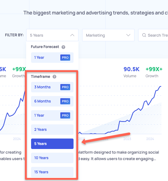Exploding Topics have limitations in the time frame for selecting the years and future forecast.
