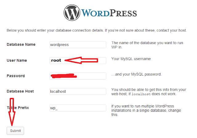 15. Enter the SQL username and password you created in PHPMyAdmin dashboard and click submit.