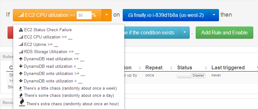 Finally.io is a SaaS application which lets you set checks and conditions on AWS EC2, RDS, and Dynamo DB to automate the processes of increasing size of DB, restarting and stopping instances.You can also do application resiliency test like chaos monkey using finally.io. You can start and stop instances once in a week, day or in an hour to check you application resiliency.
