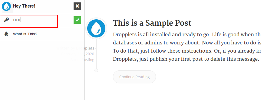 8. Now you can access the dropplets setup page using localhost or your servers ip without any errors. The initial setup asks you to set the password. Provide the password credentials and click ok. It will redirect to the login page. Click the droplet icon in the top left to enter the password to login.