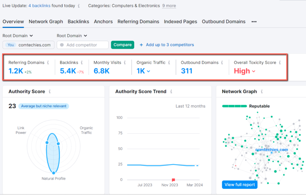 You can see referring domains, backlinks, monthly visits, organic traffic, outbound domains, and overall toxicity score here.