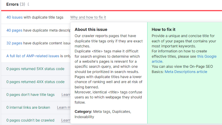 It also identifies broken links, HTTPs issues, internal linking, site performance problems, and other issues.
