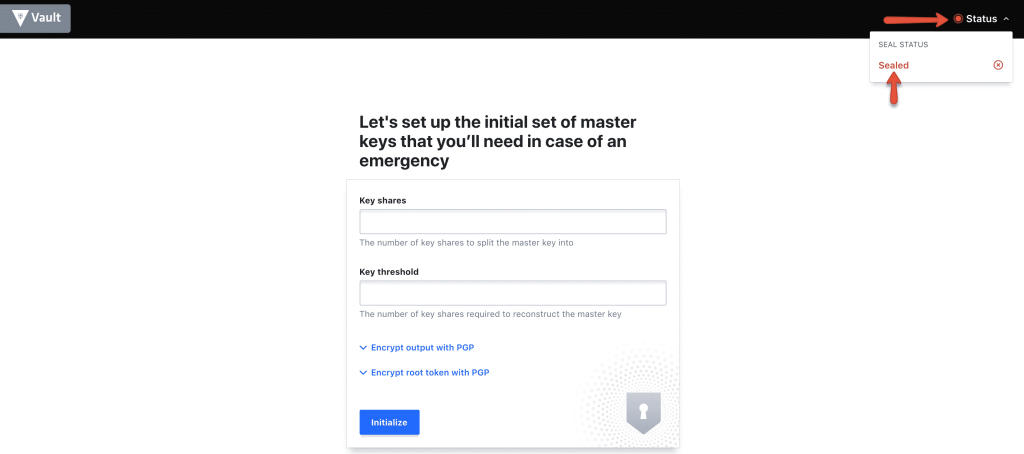 http://54.218.168.196:8200/uiWhen you access the vault UI, by default it will be sealed as shown below.